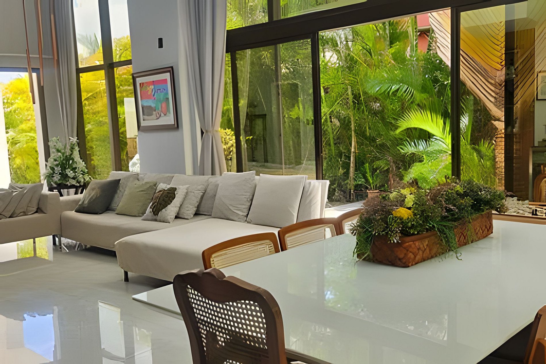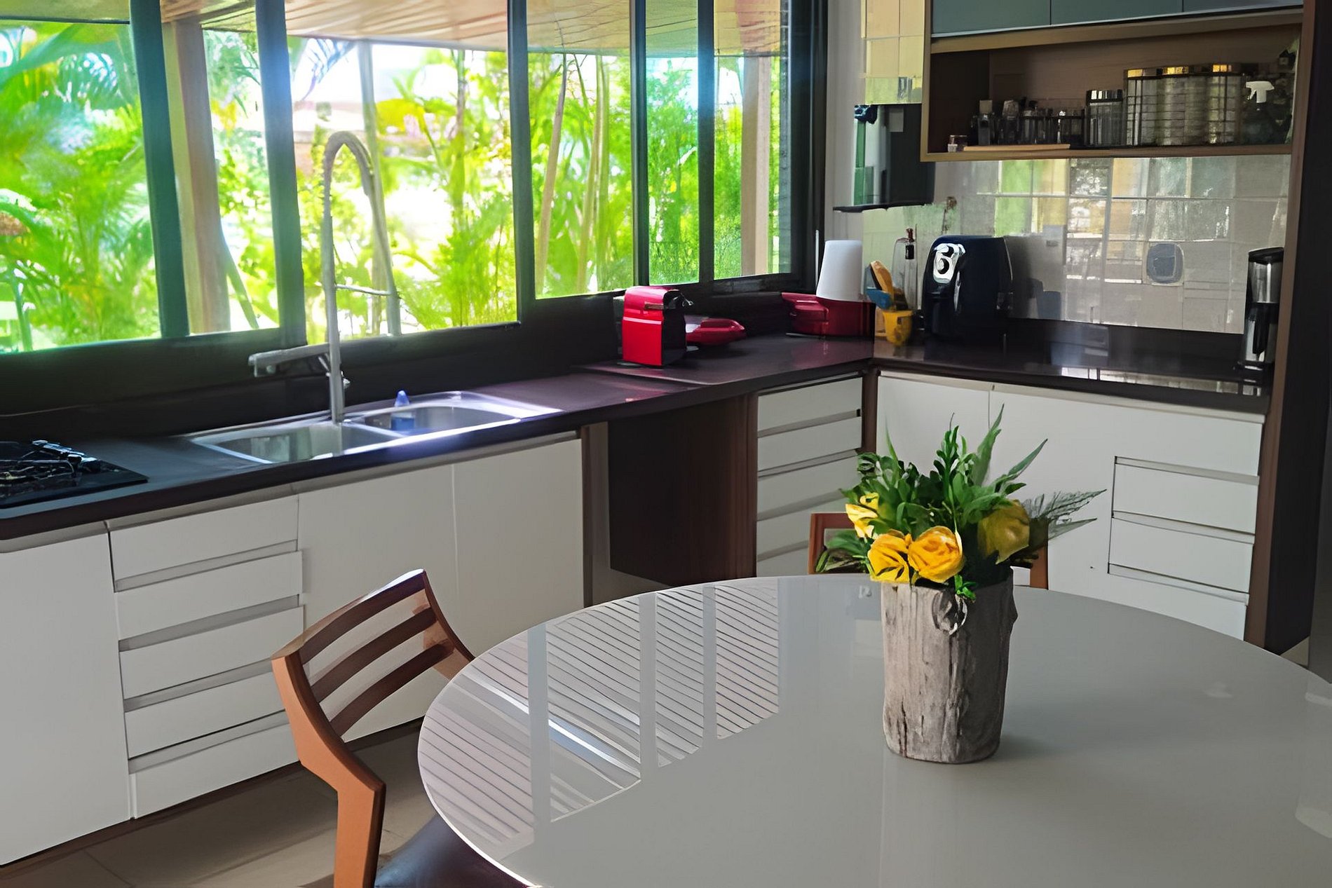 A sala integrada traz leveza à estadia, conectando cozinha, área gourmet e jardim. A cozinha é completa, com fogão, forno, geladeira, Nespresso, liquidificador, taças e utensílios que facilitam o dia a dia.
