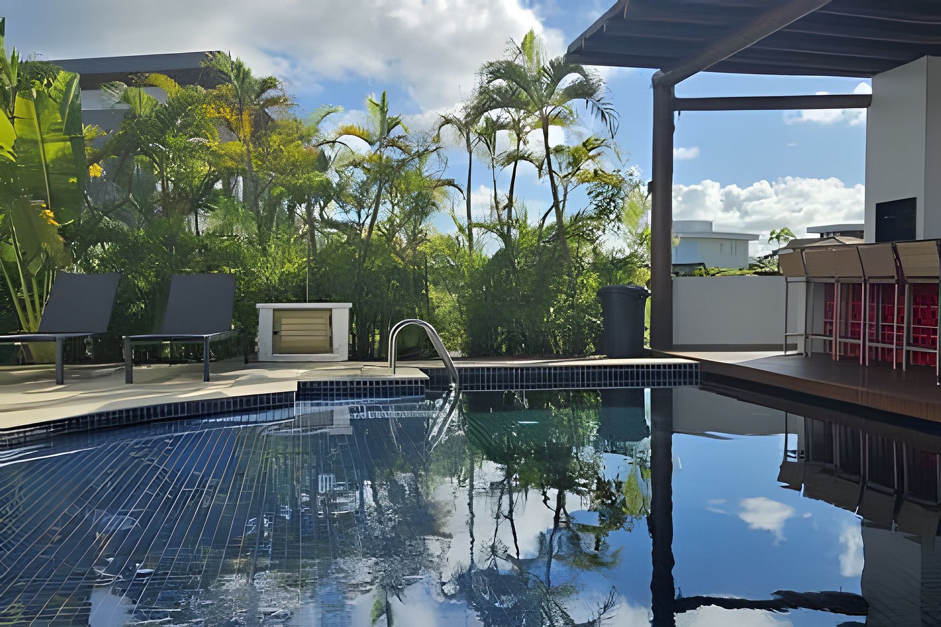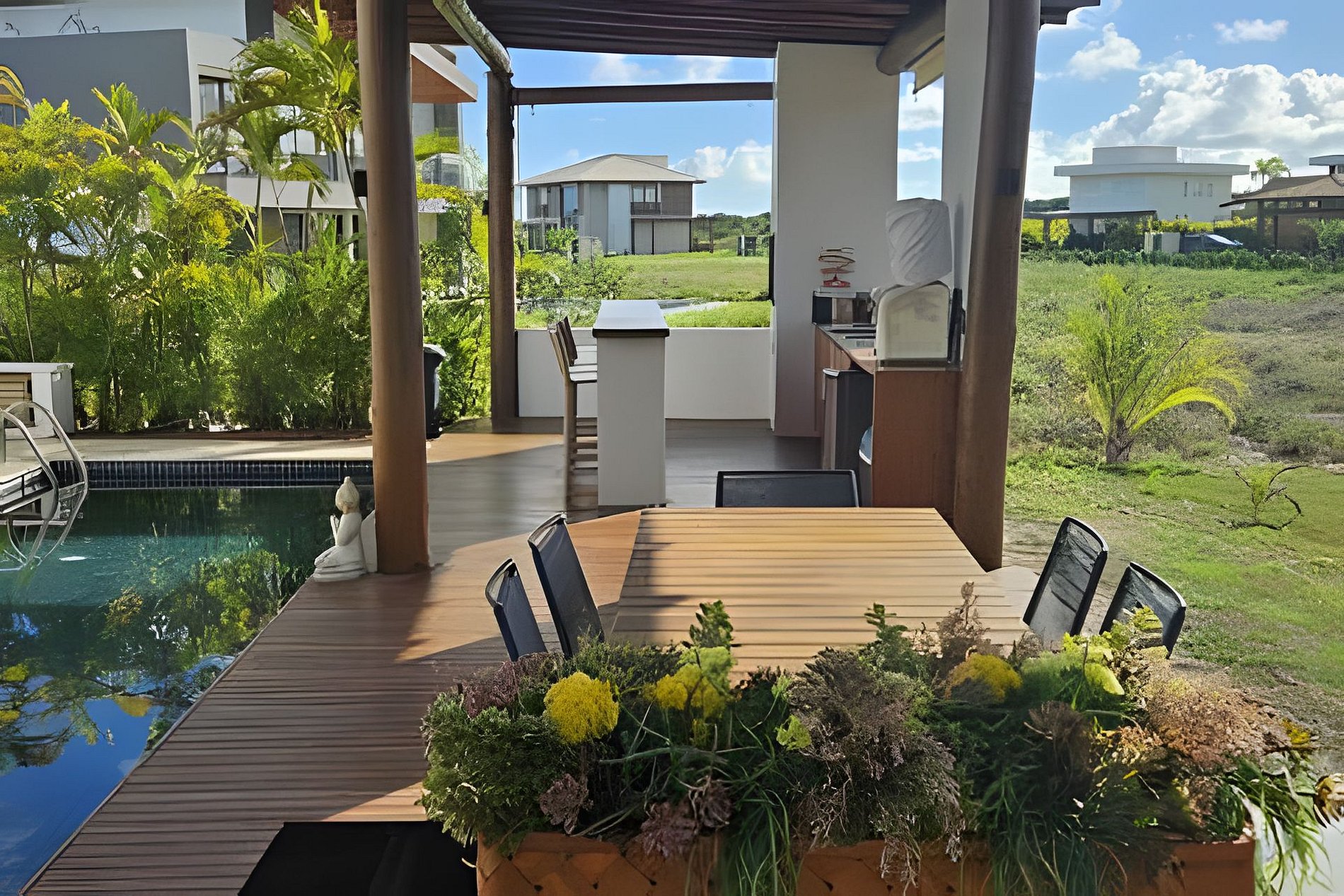 Na área externa, você encontra deck com churrasqueira, mesa para refeições ao ar livre, espreguiçadeiras e uma piscina privativa cercada pelo verde, um convite ao descanso.